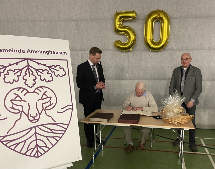Gerd Gabers beim Eintrag ins Goldene Ehrenbuch mit Samtgemeindebürgermeister Christoph Palesch (links) und Laudator Manfred Grabowski