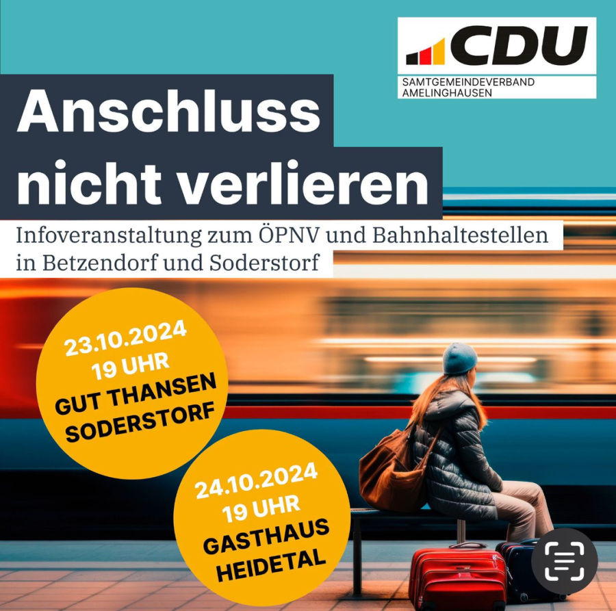 Mit zwei Veranstaltungen zum Thema Öffentlicher Personen-Nahverkehr (ÖPNV) informierte die CDU die interessierte Öffentlichkeit. Eingeladen war der Chef der kreiseigenen Gesellschaft MOIN. Die CDU Amelinghausen wirbt mit den Veranstaltungen auch für die Einrichtung der Haltepunkte in Drögennindorf und Soderstorf an der reaktivierten Bahnstrecke zwischen Lüneburg und Soltau.